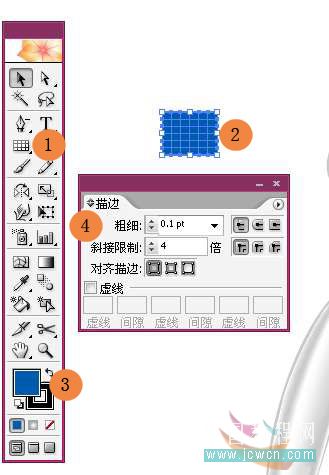15、在直線工具組中選擇矩形網格工具 ,如1. 繪制如2處的對象。設置藍色填色黑色填邊。將描邊改為0.1pt.