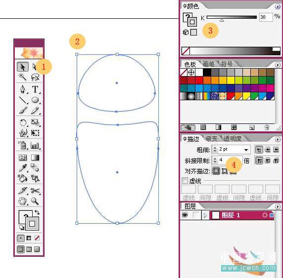 將填充色設為白色,描邊色設為30%的灰度,描邊為2pt。如果你的顏色模式為cmyk,可以在顏色面板的右上角點開這個三角按鈕,更改顏色模式。