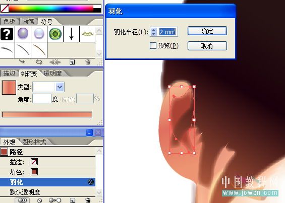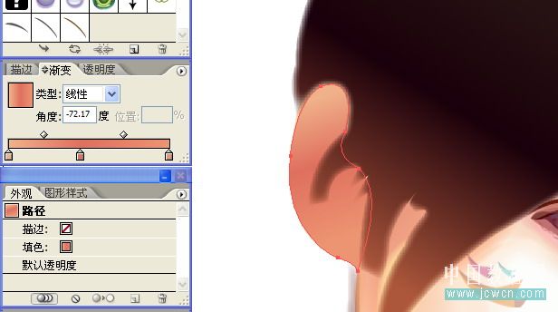 108為其添加明暗效果。這里需要運用漸變,由上靠近耳朵的地方要顏色深些,下面稍微亮些,羽化效果為2。