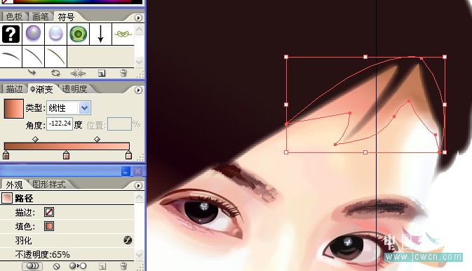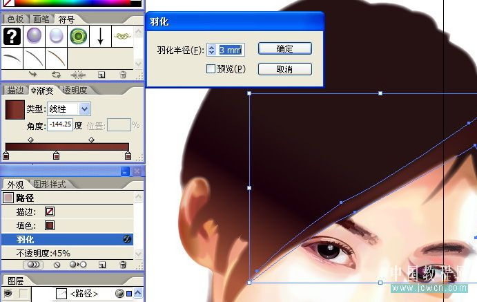 94接下來我們開始繪制頭發,我們先在主發層上撲上大體色塊,頭發前部的顏色比較淡,運用下由棕黑到棕色的漸變來處理這一區域,羽化效果為3,透明度為45%。