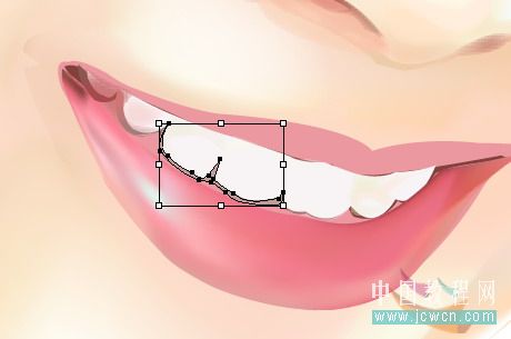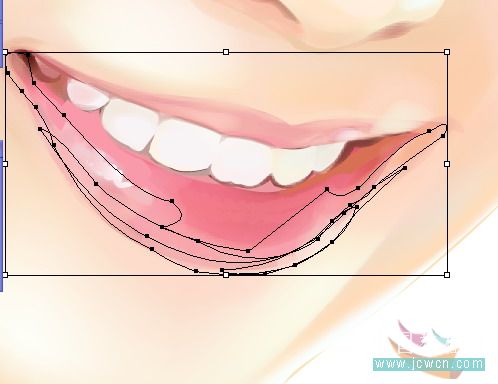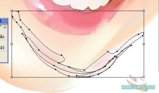 75繪制如下圖的過渡色塊,形狀與下嘴唇的形狀吻合,羽化為1.5~2。