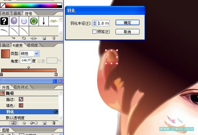 90刻畫耳朵的結構,這里用漸變突出耳朵的構造,羽化為1.8。