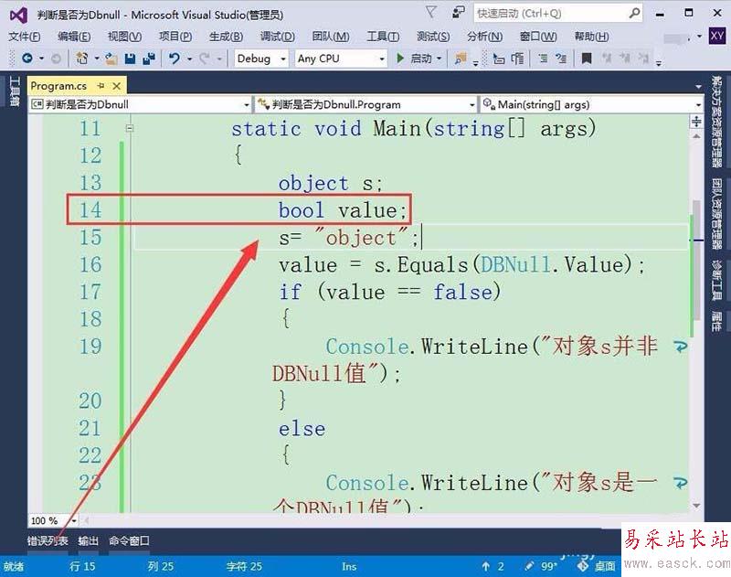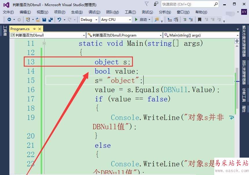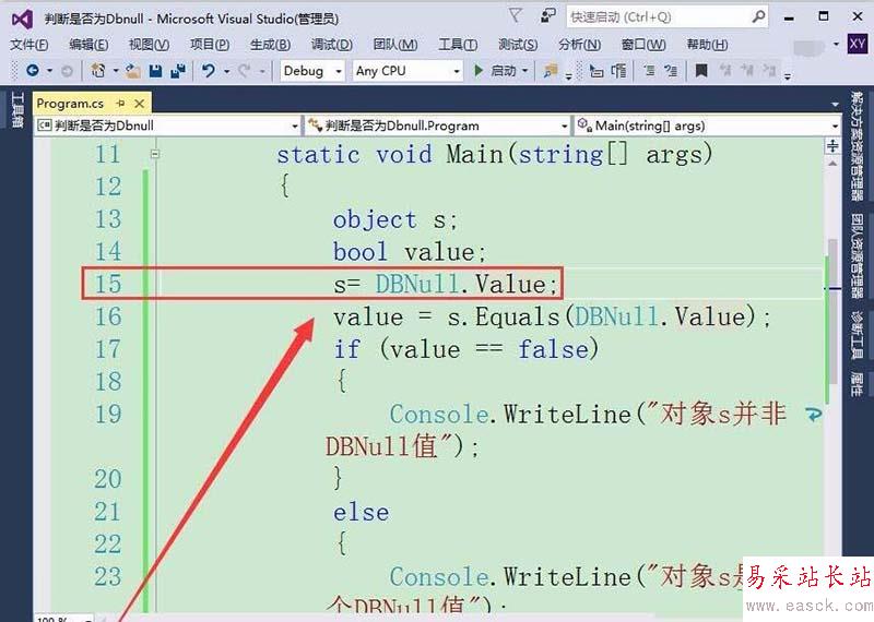4、然后,判斷變量s的值是否為DBNull.Value,用Equals實(shí)現(xiàn)判斷。
