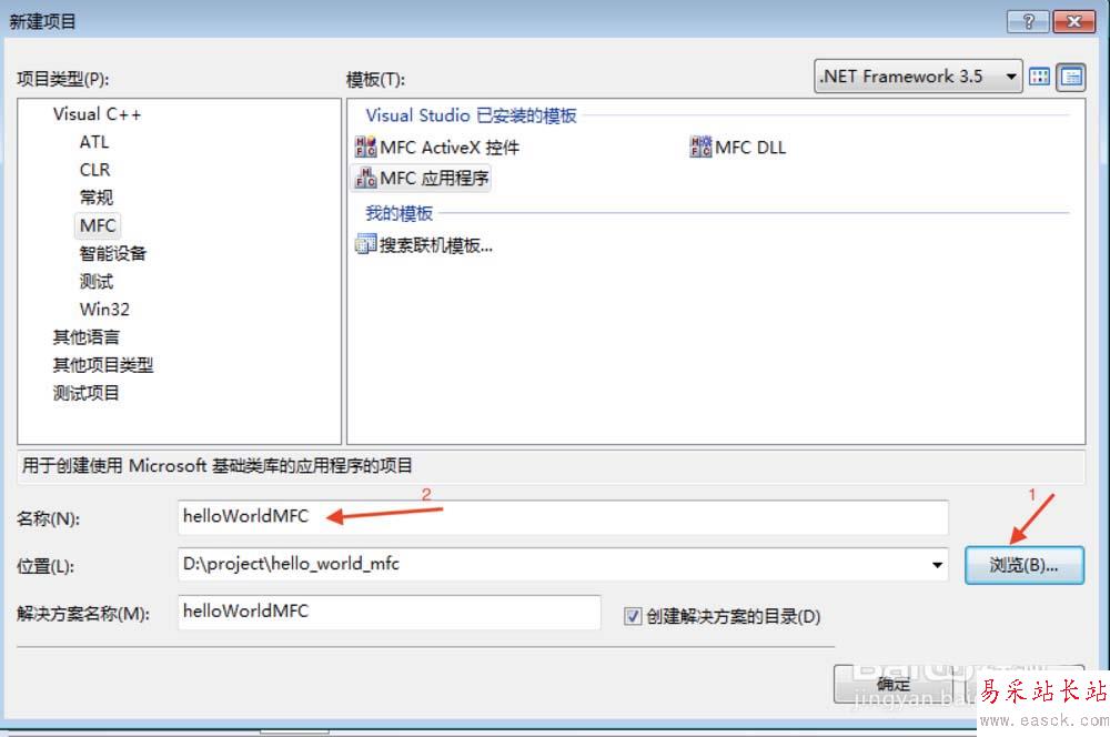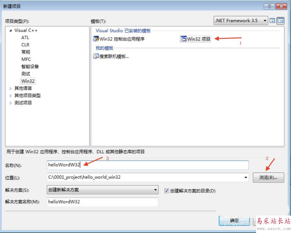 1、首先打開新建項目窗口,選擇Visual C++ -> Win32 -> Win32項目,然后選擇程序存放的路徑,以及輸入程序名稱,最后點擊“確定”