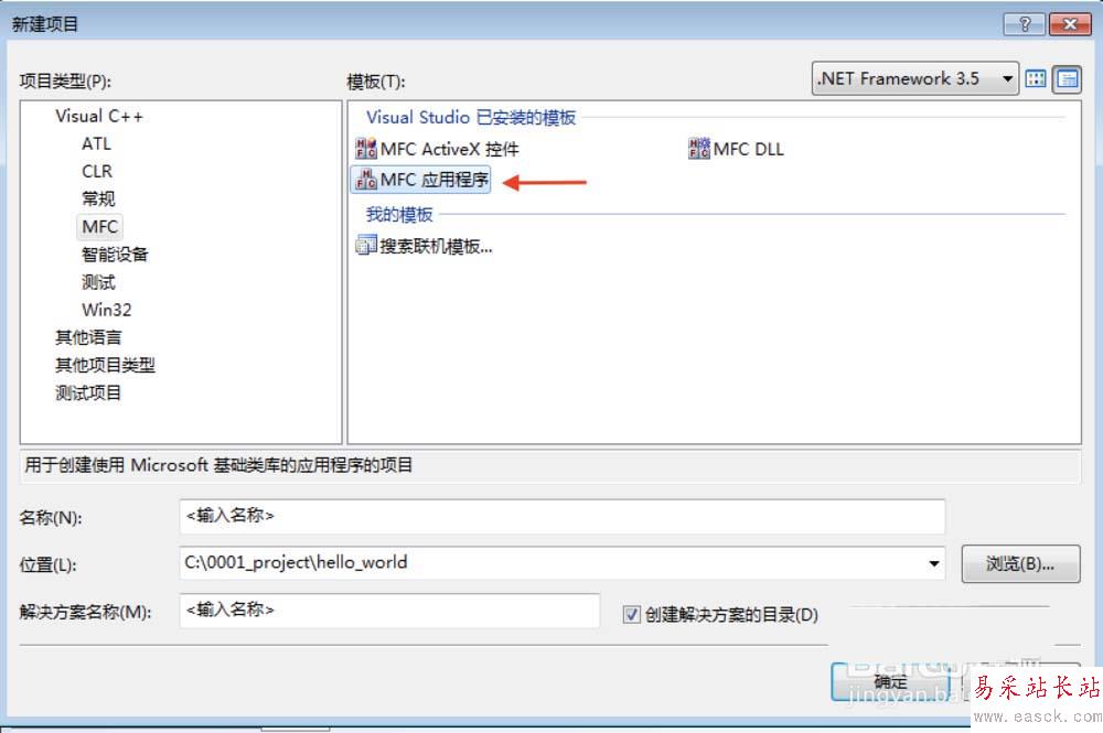 2、彈出的窗口選擇,Visual C++ -> MFC-> MFC應用程序