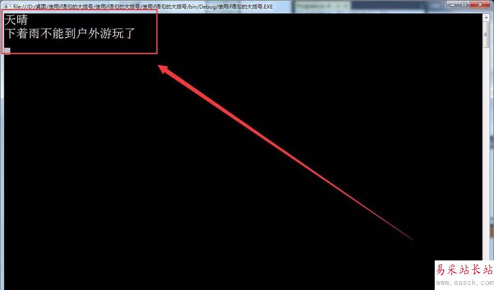 6、最后,如果條件成立,再輸出下著雨不能到戶外游玩了。