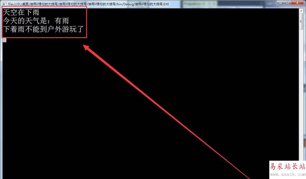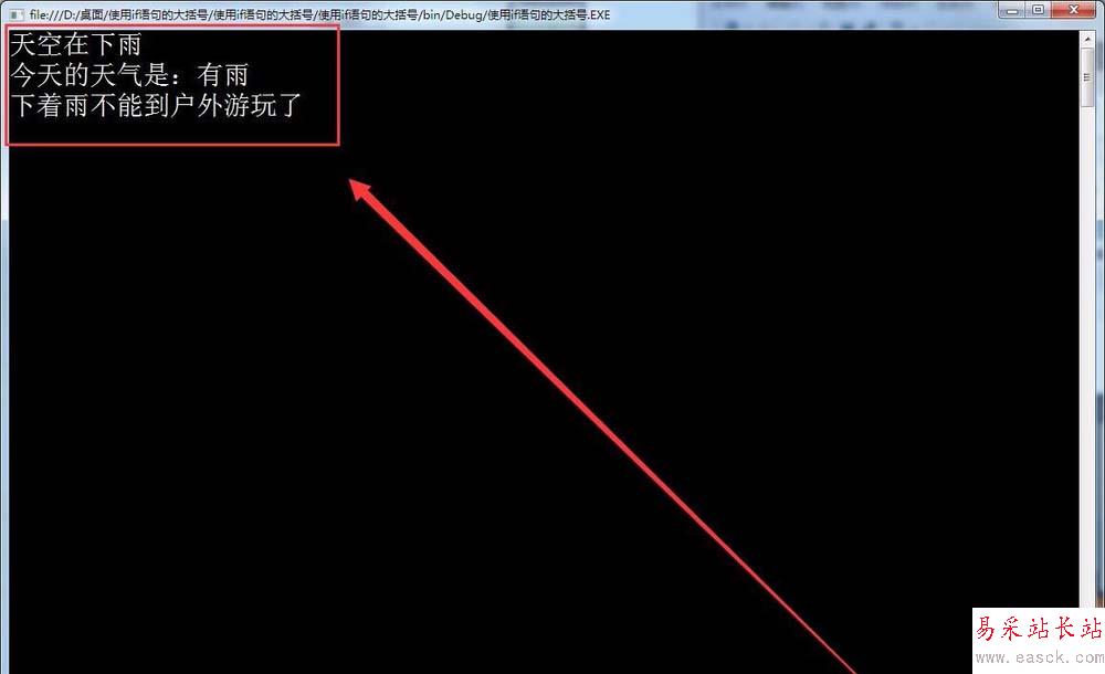 5、如果條件成立,在窗口中輸出,今天的天氣是:有雨,如下圖所示。