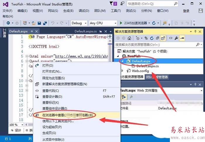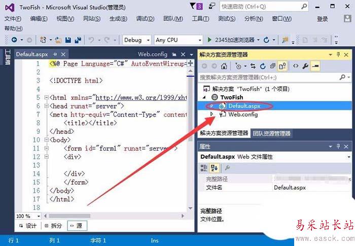 6、在“解決方案資源管理器”的項目中,可以看到我們添加的頁面“Default.aspx”。