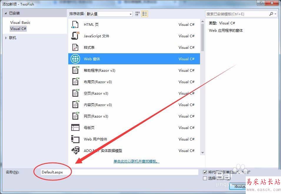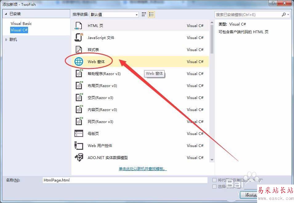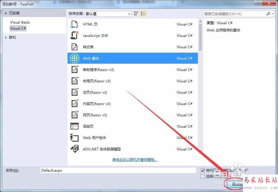 3、“添加新項”窗口中,選擇“Web窗體”選項。