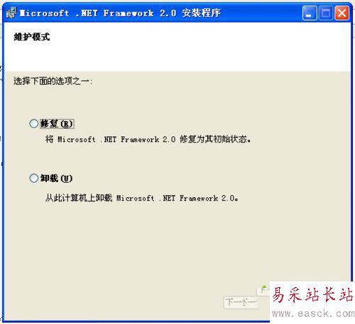 4、如果你已經安裝過了,則會提示修復或卸載Microsoft.NET Framework2.0。