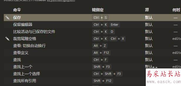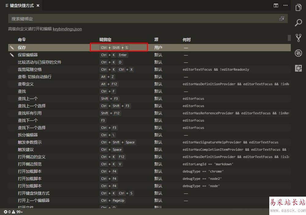 3、下面我們來修改默認快捷鍵設置,比如像修改保存命令快捷鍵,直接右鍵——更改鍵綁定;