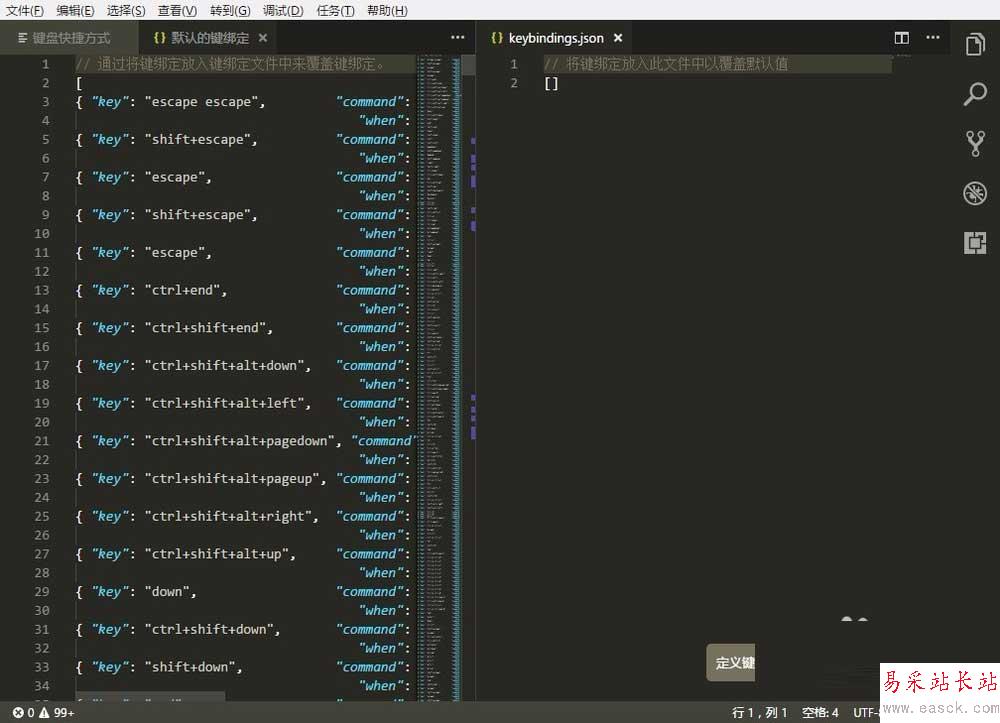 6、如果你還需要更高級的自定義快捷鍵,你可以直接點擊上面的提示“keybindings.josn”,在打開的界面右側輸入你所需要修改的鍵值即可;