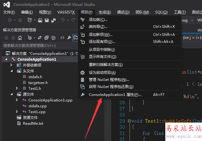 2、找到項目菜單的xxx屬性那一項,我的這個項目名字是ConsoleApplication1,所以就是ConsoleApplication1屬性(P)...
