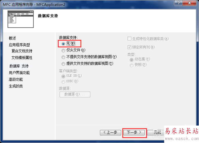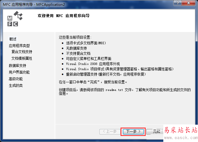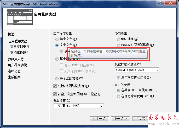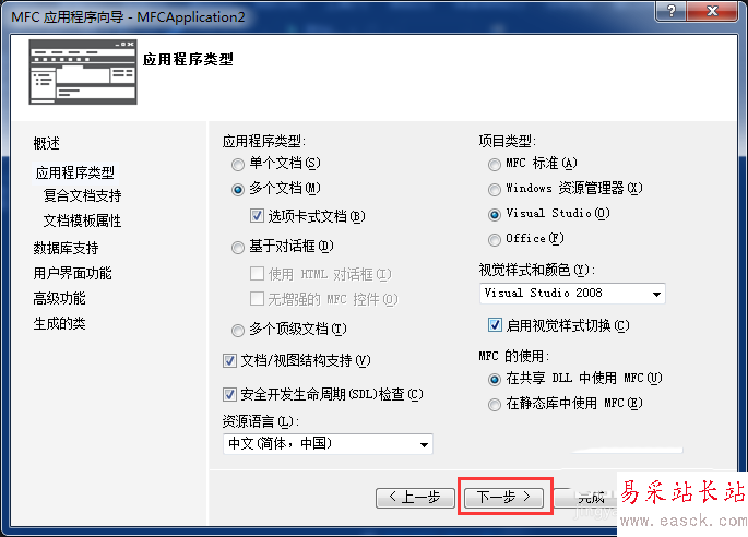 5、這個界面一般主要就是選擇應用程序類型,多文檔的是最全的,設計相對也復雜點。對話框的話,結構有些功能是用不了的。之前就吃過虧,對話框的有些功能怎么也使用不了。