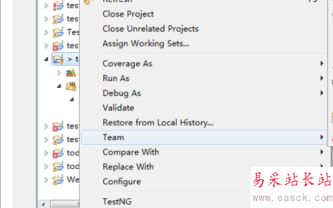 2、然后進(jìn)行選中需要合并分支代碼項(xiàng)目進(jìn)行右鍵后,彈出了下拉菜單中進(jìn)行選擇為team的選項(xiàng)。