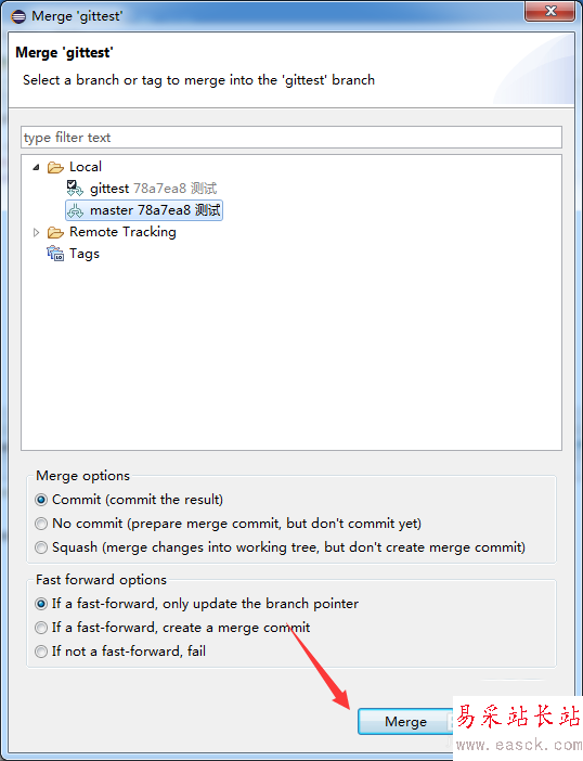 4、就會(huì)彈出了一個(gè)合并分支窗口的界面中,進(jìn)行選擇為需要合并分支上。
