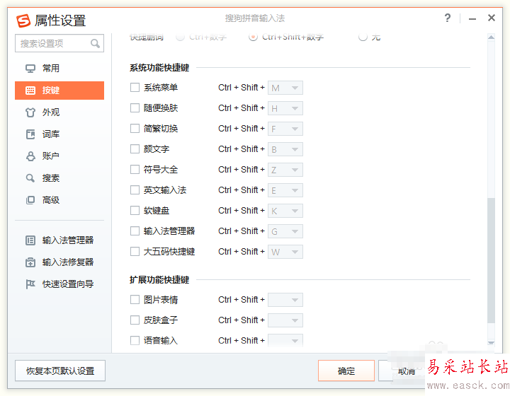 2、輸入法的快捷鍵在它的設置列表-按鍵中找,用不到的話全部取消勾選。