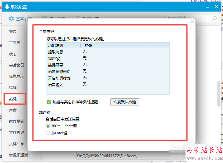 3、qq的快捷鍵也可以在設置-熱鍵中找到,不用的也可以取消勾選。它還有貼心的沖突提醒功能。