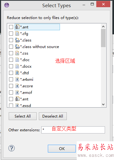 4、如圖所示,自定義文件類型界面,在需要的類型前面打勾,如果上面的列表中沒有你想要的類型,可以在下邊的other extensions輸入框內輸入自定義類型,如:.pdf,完了點OK;