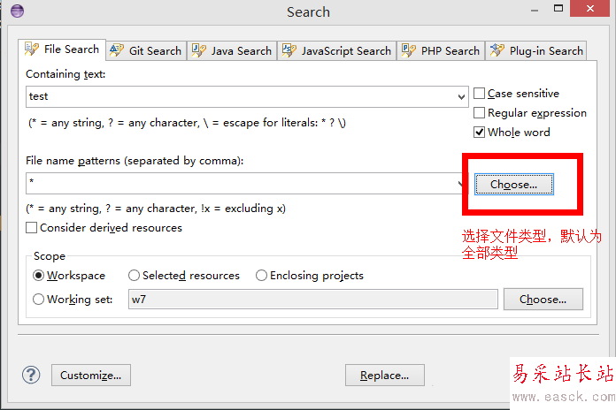 3、在Containing text下邊的輸入框內輸入你要搜索的內容,文件類型默認為*(指全部類型文件),也可以點擊右邊的choose自定義類型。