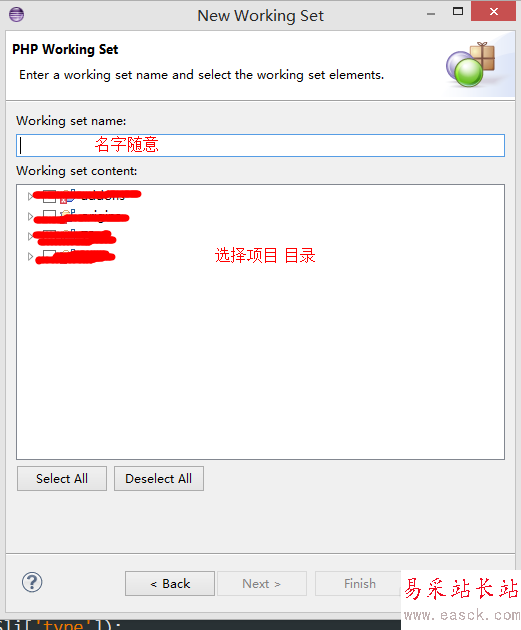 6、選擇你的項目類型(因為我工作空間已經有幾個PHP項目,這里以PHP為例),雙擊PHP文件夾,你的項目會全部列出來,選擇好項目之后,在上面的輸入框內隨便輸入一個名稱,點擊Finish,最后點擊Search搜索即可。