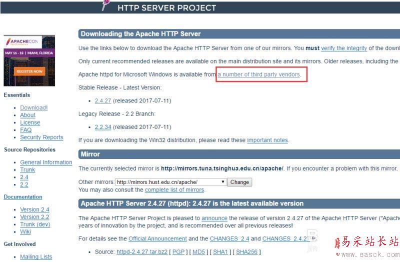 大致意思是說apache本身不提供已編譯的安裝包,只提供源碼,如果你自己無法編譯,可以選擇下面這些官方推薦的第三方提供編譯的網站。
