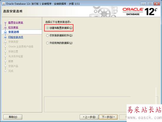 5、在“安裝選項”窗口中,選擇“創建和配置數據庫”,單擊“下一步”