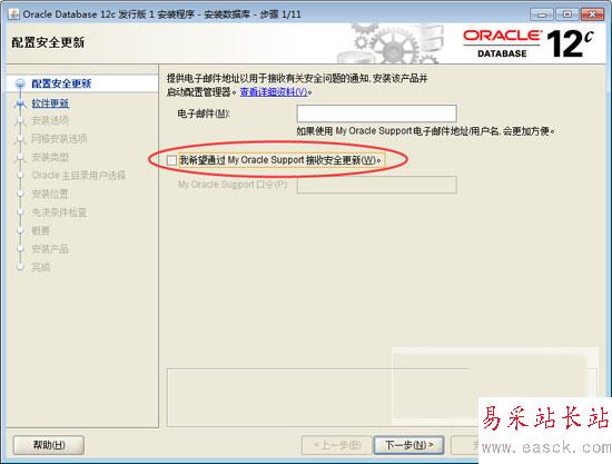 3、“配置安全更新”,取消“我希望通過My Oracle Support接受安全更新”,單擊“下一步”