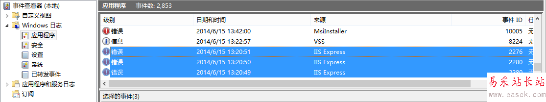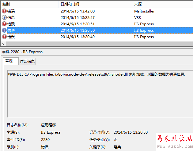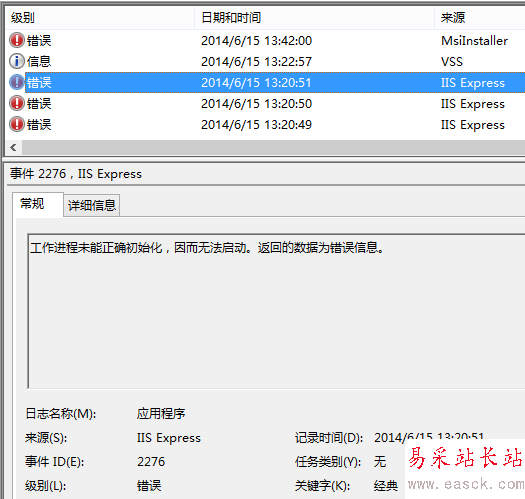問題焦點已經很清楚了,就是IIS Express未能啟動。于是想到查看事件,看有沒有記錄更具體的日志。