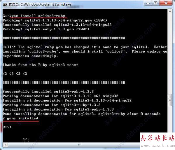 8.接下來安裝sqlite3,在cmd中輸入“gem install sqlite3-ruby”。
