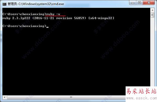 3.安裝完畢之后,打開cmd輸入"ruby -v"(不帶引號),將會出現ruby的版本,如下圖所示。