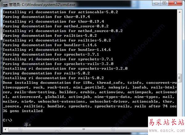 6.之后再cmd中輸入“gem install rails”開始安裝rails。此過程大約花費30分鐘左右,具體時間與機器配置有關,請耐心等待,如下圖所示。