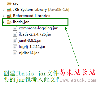 在項目中,創建新的文件夾(eg:ibatis_jar),如下圖所示,本示例中創建了ibatis_jar文件夾 ,并將項目開發需要的第三方的jar包拷貝到該文件夾中。