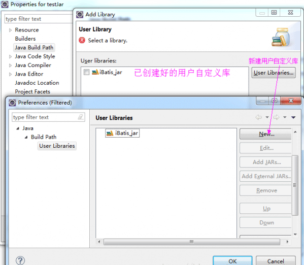 在出現的對話框中,可以選擇已經創建好的用戶自定義庫,也可以選擇User Libraries,彈出的新對話框中選擇"New",創建新的用戶自定義庫。