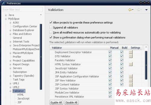 1、Windows –> Perferences –>Myeclipse –> Validation,保留manual(手動)部分,build下只留"classpath dependency Validator" 。
