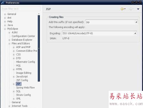 1、Window -> Preferences -> MyEclipse -> Files and Editors -> JSP。