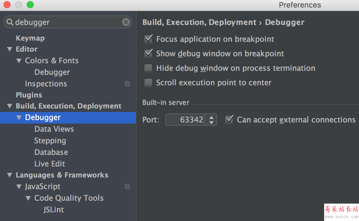 這個插件能夠跟IDE通訊,其實是通過一個Host和Port鏈接IDE的,也就是WebStorm打開時已經(jīng)自動啟動一個Debuger Server,任何遵照它的協(xié)議連接上它即可實現(xiàn)IDE調試,我們打開IDE的屬性,然后搜索Debugger,會發(fā)現(xiàn)這些配置信息,默認端口為63342