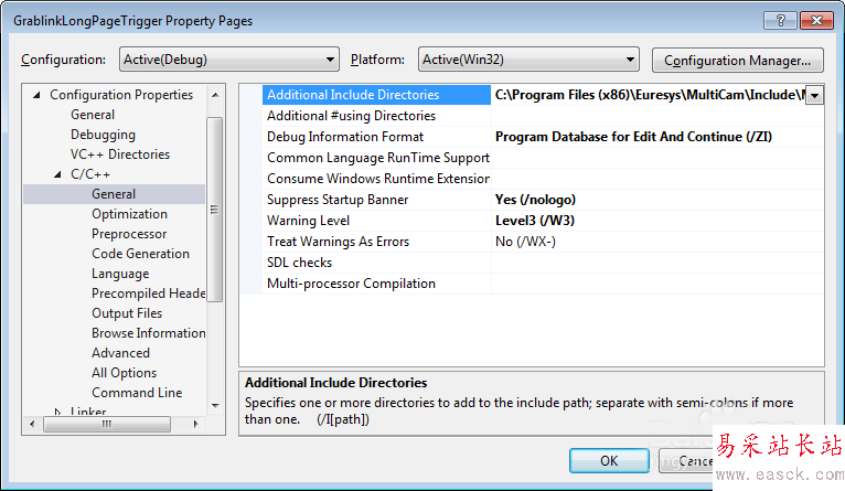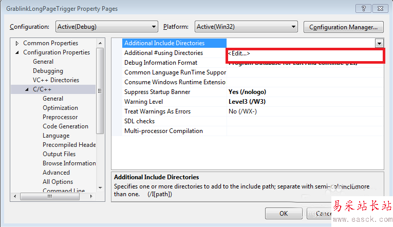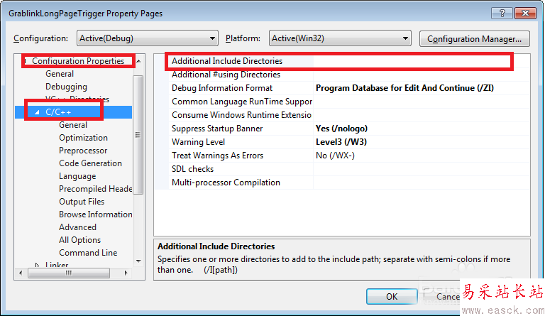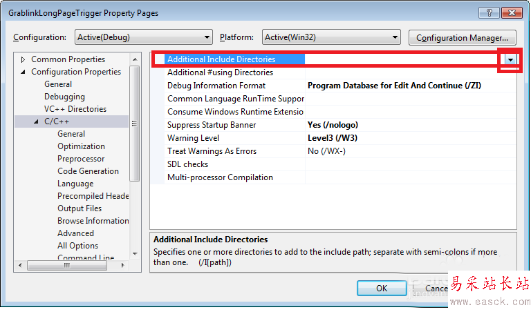 3、在屬性設(shè)置框中打開以下目錄Configuration Properties-C/C++-Additional Include Directories