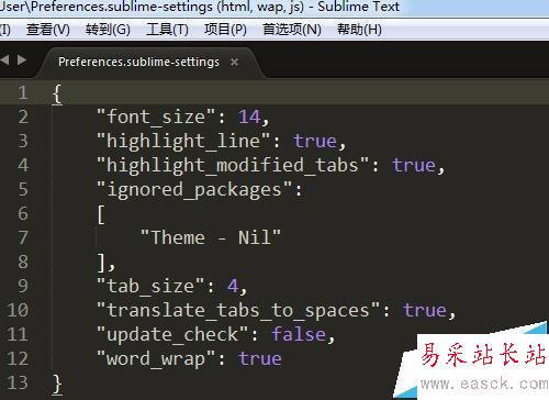 3、sublime實用的配置。打開:首選項>設置-用戶,然后可以在里面設置字體大小"font_size": 14;關閉檢測更新"update_check": false,自動換行"word_wrap": true等。