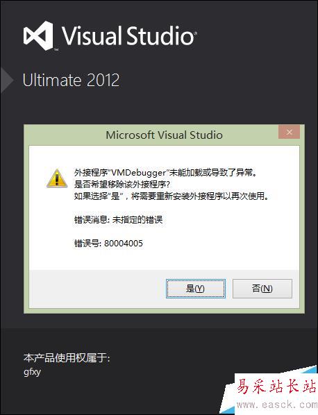 在vs2012啟動時,有時會出現以下愛錯誤:外接程序”VMDebugger”能加載或導致了異常,是否希望移除該外接程序?對于該警告,我們可以點擊是或否,關閉警告對話框,忽略警告,不過在下一次啟動vs2012時,還是會彈出警告對話框的。既然如此,那我們要如何處理該警告使其在啟動vs2012時不再彈出警告對話框呢?