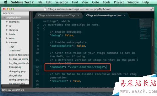 把default中的配置全部復(fù)制到user中,然后改一下command配置項(xiàng),為ctags的可執(zhí)行文件路徑/usr/local/bin/ctags