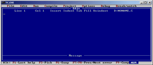 如果操作系統處于windows環境下,有兩種方法可以啟動TC。一是在windows環境下進入DOS狀態,在啟動->運行中輸入command或cmd, 進入到DOS屏幕,然后進入到TC的相應子目錄,運行TC.EXE。另一種方式是為TC.EXE創建一個快捷鍵,通過”資源管理器”找到TC.EXE運行文件,點擊右鍵,創建快捷方式,然后將快捷方式復制到桌面,可通過快方式快速啟動TC。進入Tc,您可以看到類似上面這樣的屏幕。主窗口主要分為菜單行、編輯狀態信息行、編輯窗口、消息窗口和常用命令提示行等五部分。如下圖所示: