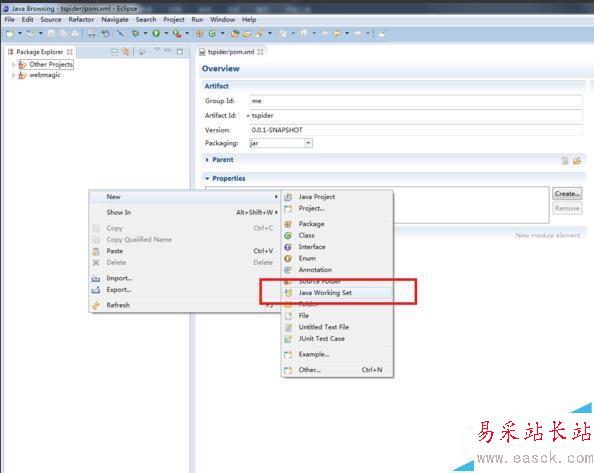 3、新建Working Set。在Package Explorer的空白處單擊右鍵,在彈出菜單中依次選擇New -> Java Working Set。