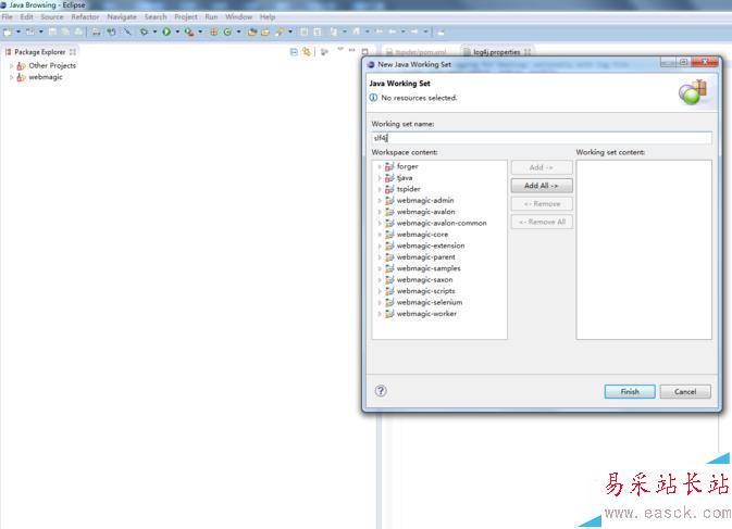 4、配置working set。在彈出的對話框中輸入working set的名稱,同時可以將package explorer中現有的project加入到新建的working set中去。