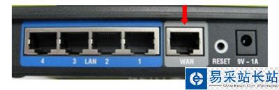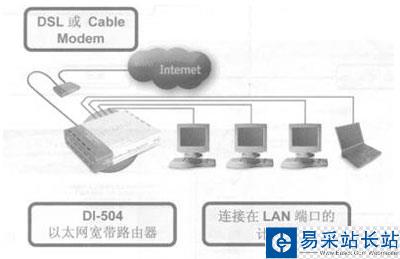 B. 將一條以太網纜線的一端插入DI-504后面板上的WAN端口,另一端插入您的DSL/Cable modem上的以太網端口。DI-504前面板的WAN口的LED指示燈亮,表明操作正確。