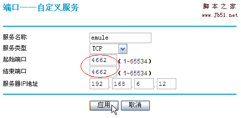 3)以eMule為例。當在局域網中使用eMule時,通常只能獲得LowID,通過端口映射后即可獲得HighID了。在”服務名稱”中添加您為此服務的命名,此處我們將其命名為eMule,”服務類型”選擇TCP(或者TCP/UDP):