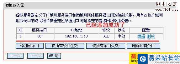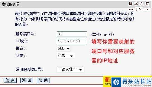3、在添加頁面中輸入“服務器端口號”“IP地址”,服務器端口號就是你需要對外網提供服務的端口號,如我內網的網頁服務器是80端口。確定后點擊“保存”