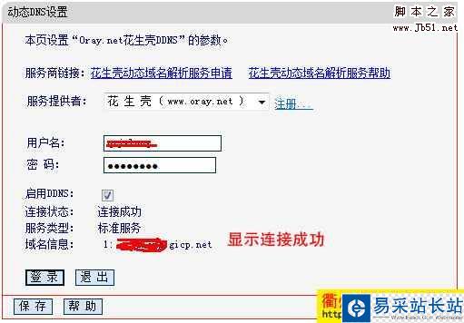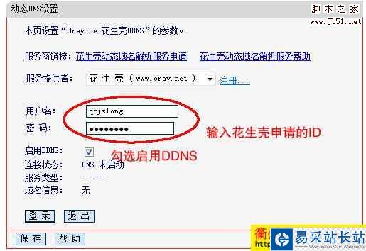 第三步:在動態(tài)DNS設(shè)置窗口中“服務(wù)提供者”里選擇“花生殼”(還有一個科邁網(wǎng),根據(jù)你自己選擇),在“用戶名”“密碼”中輸入你在花生殼申請的用戶名密碼。如果沒有帳號可點擊邊上的注冊按鈕。在“啟用DDNS”的選項里勾選。設(shè)置好后點擊下面的“登錄”按鈕