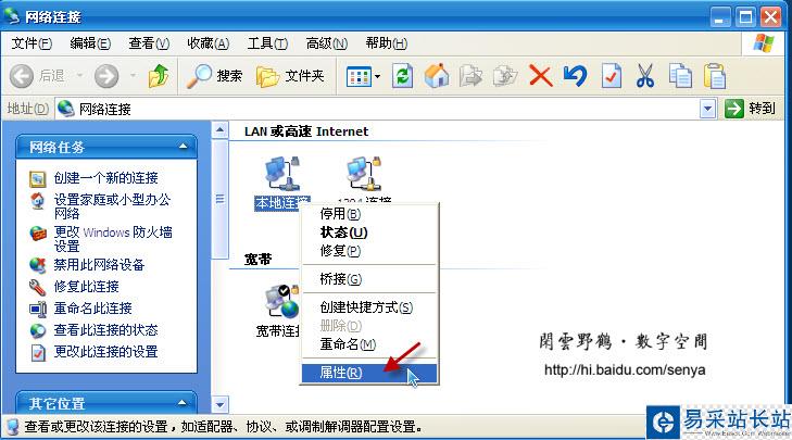 圖一右鍵單擊“網上鄰居”,在彈出的快捷菜單上單擊“屬性”命令項,打開本地連接