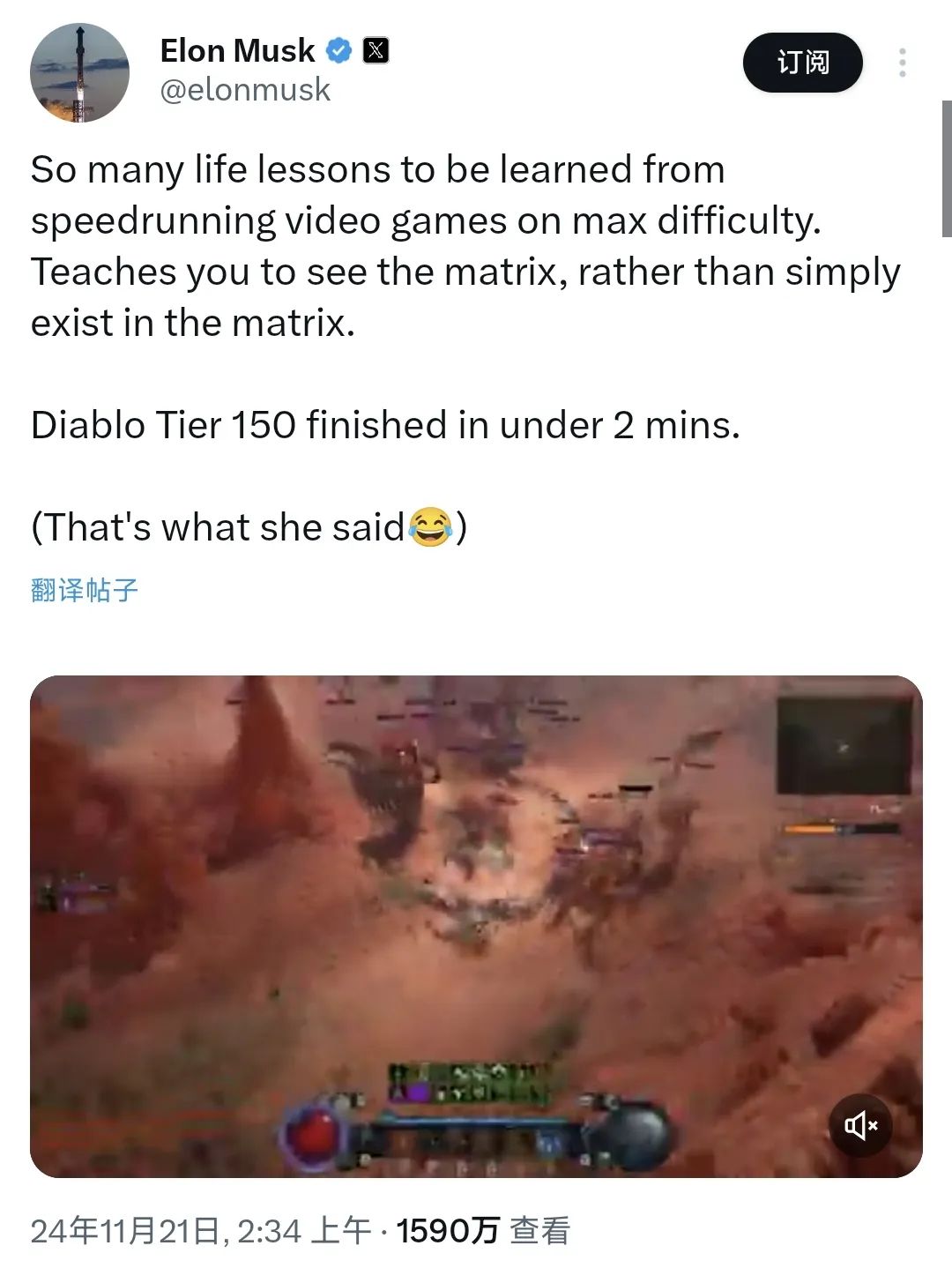 馬斯克或成暗黑4全球榜一玩家:兩分